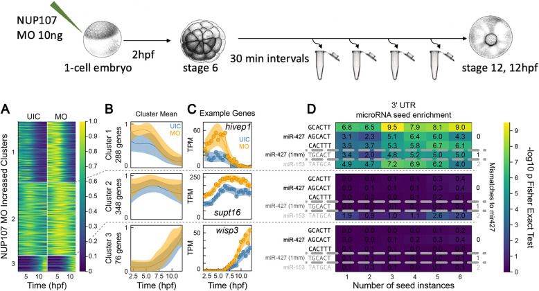 Fig. 3. Depletion of Nup107 alters temporal differential expression of specific genes. (A,B) Summary of gene clusters with increased expression by heatmap (A) and cluster average (B). Clustered data is maximum normalized Gaussian process median expression for each gene. B provides mean±s.d. for each cluster. Decreased genes and ribozero clusters given in Fig. S7A,B. (C) Gene expression examples for each increased expression cluster for UIC and MO. Data points are gene expression in TPM; central line and shaded region are transformed Gaussian process median and 95% CI, respectively. (D) Enrichment of exact instances of microRNA seeds within 3′ UTRs of genes of each cluster. Color gives Fisher’s exact test −log10 P-value between the given number of instances and a gene being present in a cluster. Seeds organized by number of mismatches to miR427 sequences; see Materials and Methods for details. Schematic at top shows illustrates the experimental workflow. MO, nup107 MO; UIC, uninjected control.