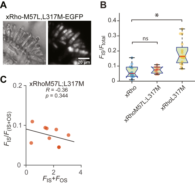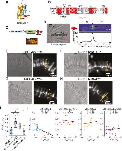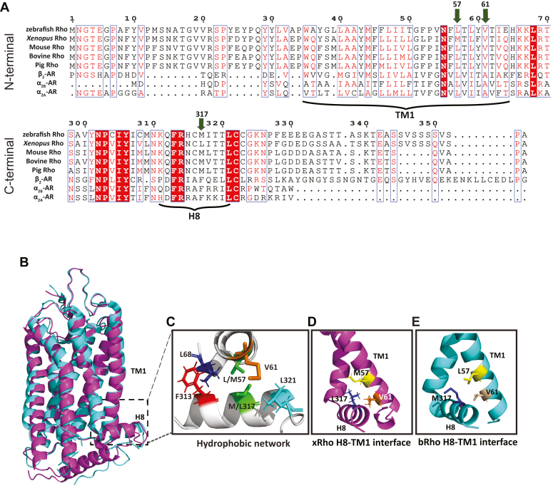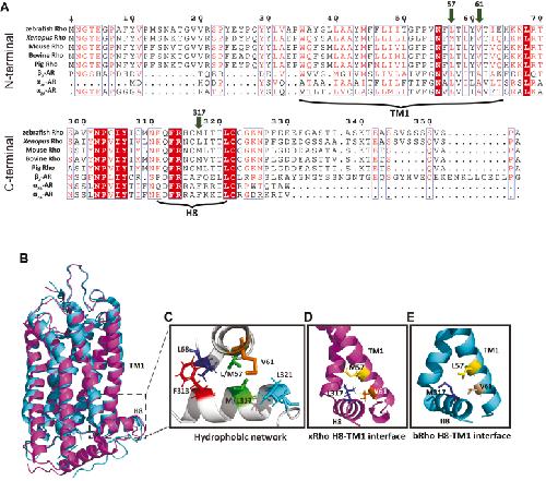 Hydrophobic interaction between the TM1 and H8 is essential for rhodopsin trafficking to vertebrate photoreceptor outer segments.