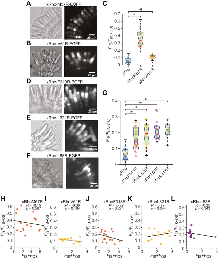 A major unsolved question in vertebrate photoreceptor biology is the mechanism of rhodopsin transport to the outer segment. In rhodopsin-like class A G protein-coupled receptors, hydrophobic interactions between C-terminal α-helix 8 (H8), and transmembrane α-helix-1 (TM1) have been shown to be important for transport to the plasma membrane, however whether this interaction is important for rhodopsin transport to ciliary rod outer segments is not known. We examined the crystal structures of vertebrate rhodopsins and class A G protein-coupled receptors and found a conserved network of predicted hydrophobic interactions. In Xenopus rhodopsin (xRho), this interaction corresponds to F313, L317, and L321 in H8 and M57, V61, and L68 in TM1. To evaluate the role of H8-TM1 hydrophobic interactions in rhodopsin transport, we expressed xRho-EGFP where hydrophobic residues were mutated in Xenopus rods and evaluated the efficiency of outer segment enrichment. We found that substituting L317 and M57 with hydrophilic residues had the strongest impact on xRho mislocalization. Substituting hydrophilic amino acids at positions L68, F313, and L321 also had a significant impact. Replacing L317 with M resulted in significant mislocalization, indicating that the hydrophobic interaction between residues 317 and 57 is exquisitely sensitive. The corresponding experiment in bovine rhodopsin expressed in HEK293 cells had a similar effect, showing that the H8-TM1 hydrophobic network is essential for rhodopsin transport in mammalian species. Thus, for the first time, we show that a hydrophobic interaction between H8 and TM1 is critical for efficient rhodopsin transport to the vertebrate photoreceptor ciliary outer segment.