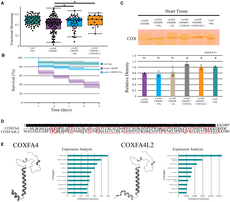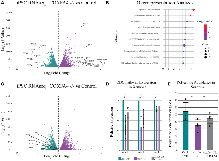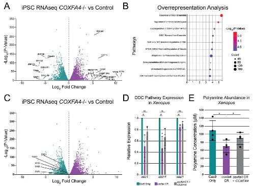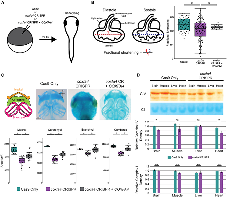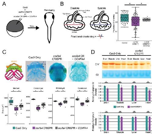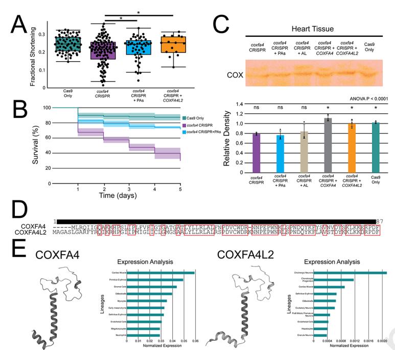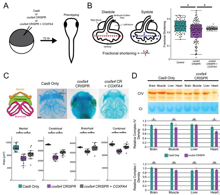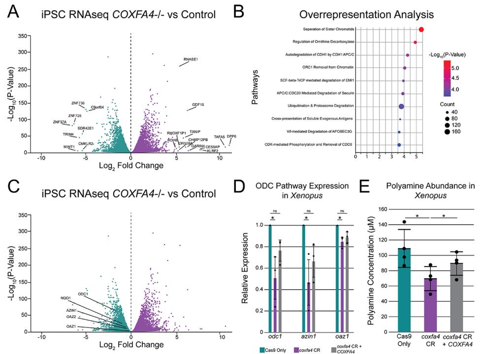 Most of the chemical energy that organisms rely on to support cellular function is generated through oxidative phosphorylation, a metabolic pathway in which electron donors NADH and FADH are oxidized through a series of successive steps to generate adenosine triphosphate. These redox reactions are orchestrated by a series of five protein complexes that sit within the mitochondrial membrane. Deficiency of cytochrome c oxidase, the fourth of these complexes, is a recognized cause of mitochondrial disease. COXFA4 encodes one of the protein subunits of cytochrome c oxidase, and variants in COXFA4 have recently been reported in individuals with a range of symptoms. These symptoms can include feeding difficulties, poor growth, cardiomyopathy, Leigh or Leigh-like disease, and neurodevelopmental delay, although these symptoms vary widely between individuals. However, a mechanistic understanding of the connection between COXFA4 loss and these varied disease manifestations is lacking. Using animal modeling in Xenopus, we explored the ramifications of coxfa4 loss of function on the early developing heart. We then conducted a hypothesis naive analysis of cellular gene expression in the context of COXFA4 deletion and discovered a downstream deficiency in the ornithine decarboxylase pathway. Small-molecule-based modulation of the ornithine decarboxylase pathway in our model modified the extent of disease, including improvement of cardiac function. Our findings point to a mechanism by which COXFA4 dysfunction leads to tissue-specific disease.