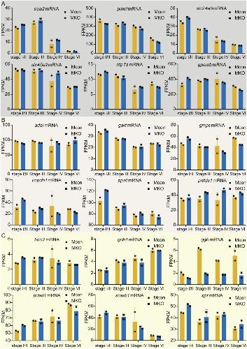 Fig. 5. The expression of key genes involved in pigment synthesis progressively decreases during oocyte development in Xenopus tropicalis. A During oocyte development in WT and mitf−/− Xenopus tropicalis, the mRNA expression levels of genes associated with melanin synthesis pathways are shown as FPKM values. B, C During oocyte development in WT and mitf−/− Xenopus tropicalis, the mRNA expression levels of genes associated with carotenoid and pteridine synthesis pathways are shown as FPKM values. For the P values of the data in figures, please refer to Additional file 2: Table S3. The statistical tests are the Wald test and the Likelihood ratio test in Deseq2 |
