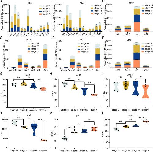 Fig. 6. Differentially expressed genes during oogenesis development in Xenopus tropicalis. A Expression of mitochondria-related genes during oogenesis in WT Xenopus tropicalis. B Expression of mitochondria-related genes during oogenesis in mitf−/− Xenopus tropicalis. C Expression of key genes regulating mitochondrial biogenesis during oogenesis in WT Xenopus tropicalis. D Expression of key genes regulating mitochondrial biogenesis during oogenesis in mitf−/− Xenopus tropicalis. E Expression of zona pellucida formation-related genes during oogenesis in WT Xenopus tropicalis. F Expression of zona pellucida formation-related genes during oogenesis in mitf−/− Xenopus tropicalis. G–J Average expression of zona pellucida formation-related genes zp2, zp3.2, zp4.2, and zp4 during oogenesis in WT and mitf−/− Xenopus tropicalis. K–L Average expression of meiosis-related genes pcnt and tacc3 during oogenesis in WT and mitf−/− Xenopus tropicalis. Results are shown as FPKM values. For A–F, the statistical tests are the Wald test and the Likelihood ratio test in Deseq2. For G–L, the statistical tests are the one-way ANOVA |