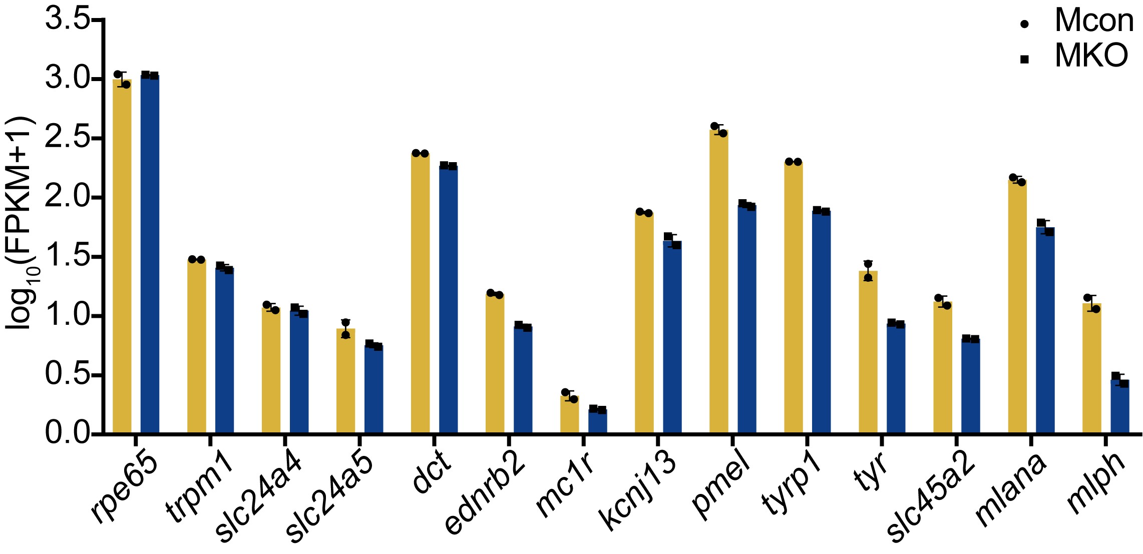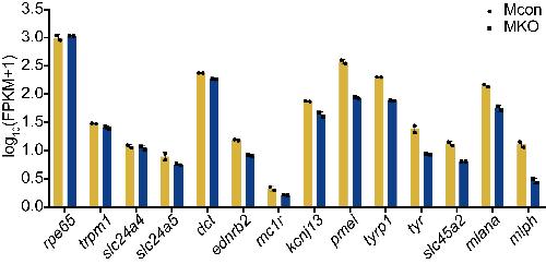 Supplementary Figure S4. Differential expression of genes related to RPE cells and melanocytes in the eyes of WT and mitf-/- Xenopus tropicalis. Mcon denotes WT Xenopus tropicalis eye samples, while MKO denotes mitf-/- Xenopus tropicalis eye samples. |