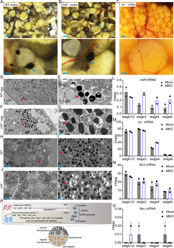 Fig. 3. Tyr regulates melanin deposition in Xenopus tropicalis oocytes. A–C Representative images show the ovarian from 1-year-old WT, mitf−/−, and tyr−/− female Xenopus tropicalis, with three frogs observed for each genotype (n = 9 frogs). In A and B, magnified views of black spots on the ovarian peritoneum, indicated by blue arrows in the upper panels, are shown in the corresponding lower panels and are also indicated by blue arrows. The scale bars in the upper panels of A, B, and C are 0.5 mm, and in the lower panels, they are 0.1 mm. D, F Figures present TEM images of oocytes from one-year-old WT and mitf−/− Xenopus tropicalis. E and G are enlarged views of the regions indicated by red arrows in D and F, respectively. H, J Figures display TEM images of black spots on the ovarian peritoneum of 1-year-old WT and mitf−/− Xenopus tropicalis. I and K are enlarged views of the regions indicated by red arrows in H and J, respectively. The scale bars are as shown in the images. All images in D–K are representative (n = 3 frogs). L–O Figures show the mRNA expression levels of mitf, tyr, tfe3, and tfec during oocyte development in WT and mitf−/− Xenopus tropicalis, presented as FPKM values. P The cartoon provides a schematic diagram summarizing the possible molecular mechanisms regulating melanin deposition in Xenopus tropicalis oocytes. For the P values of the data in L–O, please refer to Supplementary Table S3. The statistical tests are the Wald test and the Likelihood ratio test in Deseq2 |