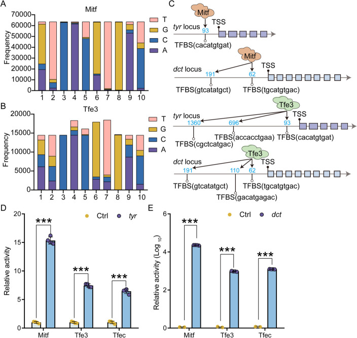 Fig. 4. MiT family transcription factors Tfe3, Mitf, and Tfec regulate the expression of the tyr and dct genes. A–B show the nucleotide frequency of different bases at various positions within the DNA binding motifs for Mitf and Tfe3. Data were obtained from JASPAR. C The DNA binding motifs for Mitf and Tfe3 in the promoter region of tyr and dct (2000 bp upstream of the transcription start site, TSS). The blue numbers indicate the distance (in base pairs) from the TSS. Data were obtained from JASPAR and NCBI. D–E Present dual-luciferase assay results for the regulation of tyr and dct expression by Mitf, Tfe3, and Tfec (n = 4). *** indicates a P value < 0.001, as determined by an unpaired t test |