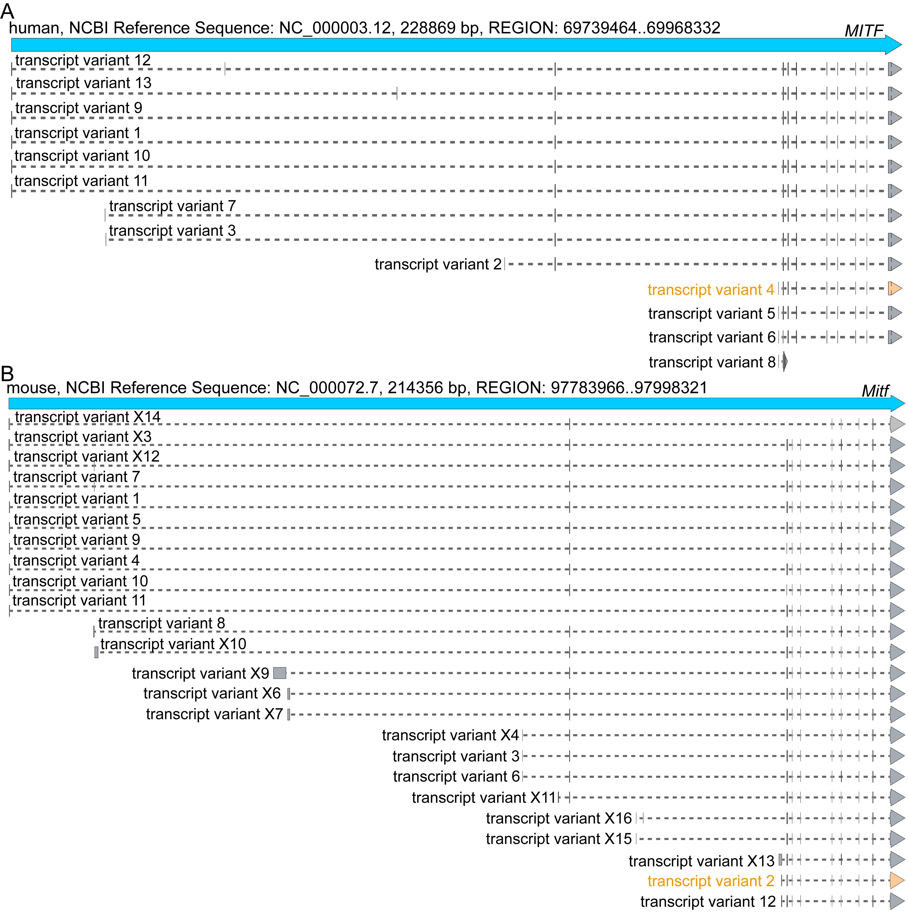 Supplementary Figure S1. Transcripts of human MITF (A) and mouse Mitf (B). For detailed information, refer to NCBI |