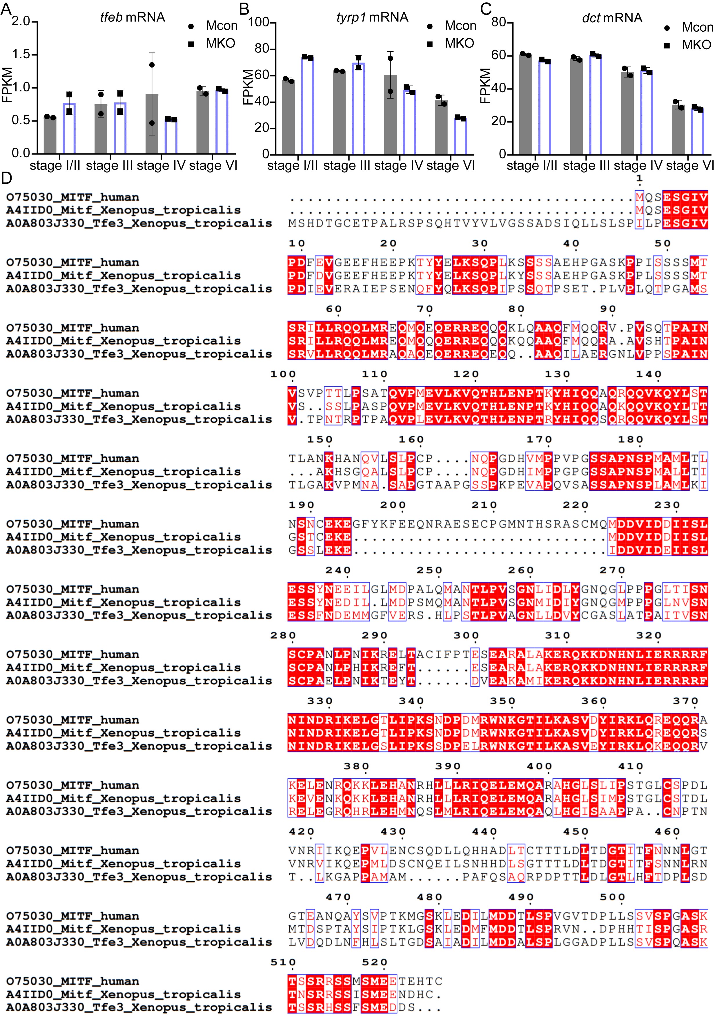 Supplementary Figure S6. A-C, Expression levels of tfeb,tyrp1, and dct mRNA during oocyte development in WT and mitf-/- Xenopus tropicalis. D, Comparison of amino acid sequences of human MITF-A, Xenopus tropicalis Mitf, and Xenopus tropicalis Tfe3 proteins. Protein sequence information was obtained from https://www.uniprot.org/. |