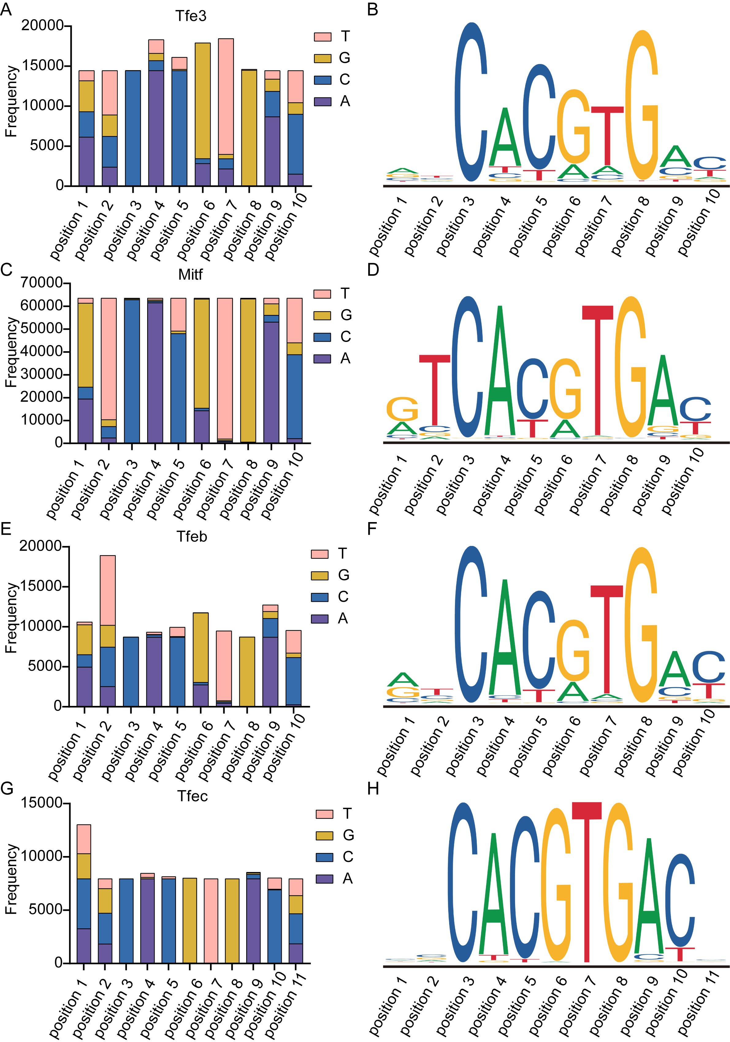 Supplementary Figure S7. The DNA motifs bound by MiT family transcription factors were derived from JASPAR (http://jaspar.genereg.net/). Panels A-B, C-D, E-F, and G-H display the nucleotide frequency and motif sequences at different positions for Tfe3, Mitf, Tfeb, and Tfec, respectively. |