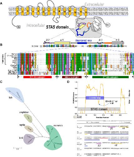 Figure 2. Alignment of partial STAS domains for SpoIIAA, sulfate transporters in Arabidopsis, and SLC26 family members. A, alignment of STAS domains for SpoIIAA, sulfate transporters in Arabidopsis, and SLC26 family members (shown from β2 to α2 region). The disordered loop (blue block), a conserved loop (orange block), and a conserved phosphorylation motif (D[S/T](2)G) (red block) are indicated. B, alignment of the disordered loop for Slc26a9 members. A Ser/Thr cluster (red block) is indicated in human SLC26A9. The Slc26a9 disordered loop (blue block) can be subdivided into three subregions: K/R-rich (red block); middle (wine block), and S/T-rich (green block). STAS, sulfate transporter and anti-sigma. |