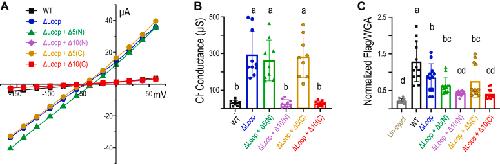Figure 6. Functional investigate the boundaries of the disordered Loop within STAS domain of SLC26A9.A, I to V relationship obtained from voltage-clamp experiments in Xenopus oocytes expressing SLC26A9-WT, SLC26A9 ΔLoop, SLC26A9 ΔLoop + Δ5(N), SLC26A9 ΔLoop + Δ10(N), SLC26A9 ΔLoop + Δ5(C), and SLC26A9 ΔLoop + Δ10(C) in standard ND96 solution. For clarity, SDs are not shown here but rather in Fig. S1. B, the conductance calculated as the slope of I to V curves from voltage-clamp experiments in Xenopus oocytes expressing SLC26A9 WT, SLC26A9 ΔLoop, SLC26A9 ΔLoop+Δ5(N), SLC26A9 ΔLoop+Δ10(N), SLC26A9 ΔLoop+Δ5(C), and SLC26A9 ΔLoop+Δ10(C) in standard ND96 solution. Individual points in bar graphs are individual oocyte experiments. Error bars represent mean ± SD (n = 10–12). The results of the statistical analysis are indicated by lowercase letters, that is,. groups sharing letters are statistically similar, whereas those not sharing any letters are significantly different (p < 0.0001, one-way ANOVA with post hoc Tukey test for multiple comparisons). C, the normalized ratio of anti-Flag signal versus wheat germ agglutinin (WGA) signal representing the relative surface protein expression level were displayed for triple-Flag–tagged SLC26A9WT, triple-Flag–tagged SLC26A9 ΔLoop, triple-Flag–tagged SLC26A9 ΔLoop+Δ5(N), triple-Flag–tagged SLC26A9 ΔLoop+Δ10(N), triple-Flag–tagged SLC26A9 ΔLoop+Δ5(C), and triple-Flag–tagged SLC26A9 ΔLoop+Δ10(C). The uninjected oocytes were used as negative controls. Individual points in bar graphs are individual oocyte experiments. Error bars represent mean ± SD (n = 10–12). The results of the statistical analysis are indicated by lowercase letters, that is,. groups sharing letters are statistically similar, whereas those not sharing any letters are significantly different (p < 0.0001, one-way ANOVA with post hoc Tukey test for multiple comparisons). Representative stained oocyte images used for quantification (panel C) are shown in Fig. S2. STAS, sulfate transporter and anti-sigma. |
