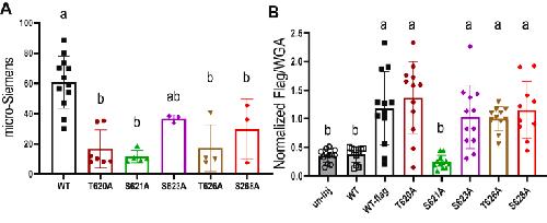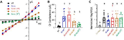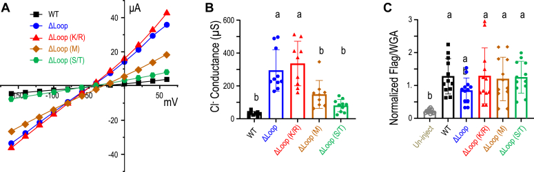 Figure 8. The conductance and surface protein expression of human SLC26A9, its Ala-substitutions in Ser/Thr-rich motif. A, the conductances calculated as the slope of I to V curves from voltage clamp experiments in Xenopus oocytes expressing SLC26A9 WT, T620A, S621A, S623A, T626A, and S628A ala-substitutions of SLC26A9 in standard ND96 solution. Individual points in bar graphs are individual oocyte experiments. Error bars represent mean ± SD. The results of the statistical analysis are indicated by lowercase letters, that is,. groups sharing letters are statistically similar, whereas those not sharing any letters are significantly different (p < 0.0001, one-way ANOVA with post hoc Tukey test for multiple comparisons). B, the normalized ratio of anti-Flag signal versus wheat germ agglutininsignal representing the relative surface protein expression level were displayed for triple-Flag–tagged SLC26A9 WT, its T620A, S621A, S623A, T626A, and S628A Ala-substitutions, and triple-Flag–tagged SLC26A9 Δloop. Staining of representative oocyte-cryosections with individual labeling are shown in Fig. 10. The uninjected oocytes and oocytes expression nontagged SLC26A9 (WT) were used as negative controls. Individual points in bar graphs are individual oocyte experiments. Error bars represent mean ± SD. The results of the statistical analysis are indicated by lowercase letters, that is, groups sharing letters are statistically similar, whereas those not sharing any letters are significantly different (p < 0.0001, one-way ANOVA with post hoc Tukey test for multiple comparisons). |