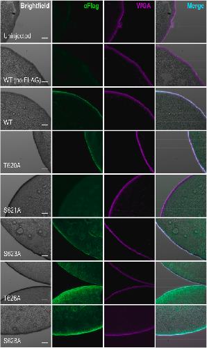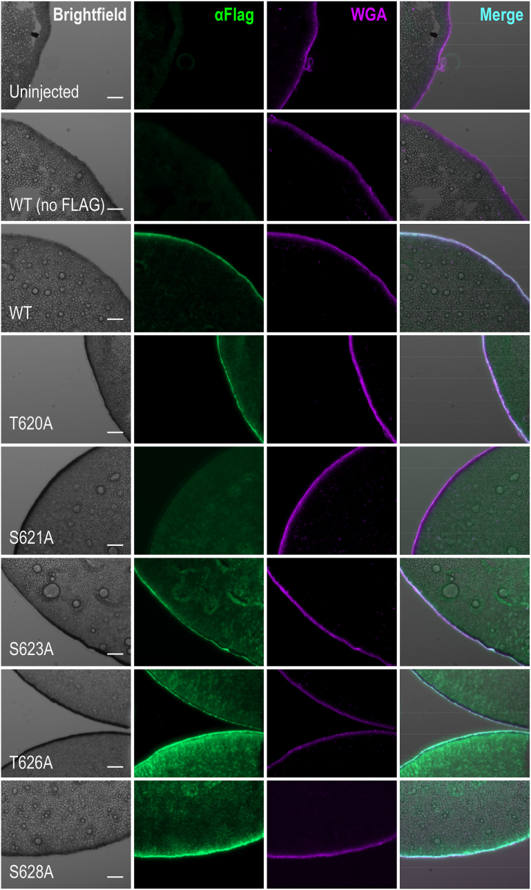 Figure 9. Immunofluorescent images for cell surface expression detection of SLC26A9 and its Ala-substitutions in S/T motif within STAS domain. Representative brightfield, immunofluorescent staining microscopy images, or merged channels of frozen tissue sections of Xenopus oocytes: uninjected, untagged human SLC26A9, 3xFLAG-tagged human SLC26A9, 3xFLAG-tagged Ala-substitutions (T620A, S621A, S623A, T626A, and S628A). The oocyte cell membrane (wheat germ agglutinin-Alexa Fluor 647, WGA, purple) and triple-FLAGtagged SLC26A9 (αFlag, green). Scale bars represent 50 μm. Individual points in Fig. 8B bar graphs are individual oocyte replicates of the staining and quantification. STAS, sulfate transporter and anti-sigma. |