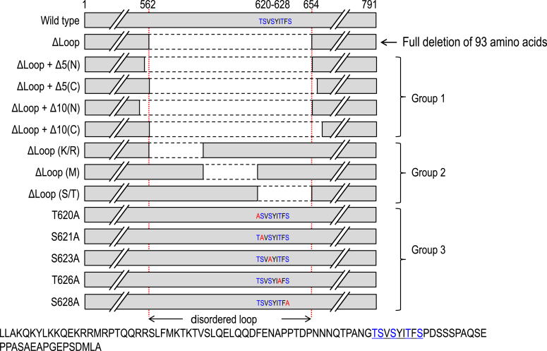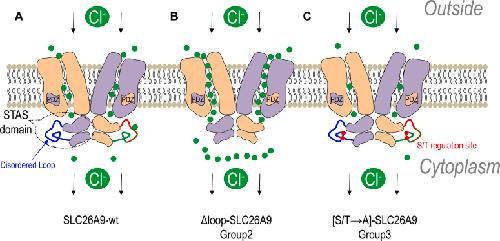 Figure 3. Schematic diagram of SLC26A9 deletions and mutants within disordered loop. Those SLC26A9 deletions and mutants in the disordered loop are categorized into three groups for the purpose of defining the borders (Group 1); analyzing the subregions (Group 2) and analyzing the potential phosphorylation sites (Group 3). Dashed lines indicate deleted sequence. Numbers denote amino acid position of the human SLC26A9. In 620 to 628 S/T-rich motif, Serine/Threonine residues are highlighted as blue color. Alanine residues are highlighted as red color in Ala-replacement mutants. Individual deletions and mutants with indicated amino acid positions were constructed and expressed in Xenopus oocytes. |
