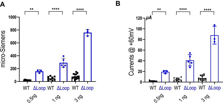 Figure 5. Dose-dependent effect of Cl-current in SLC26A9 ΔLoop. A, the conductance (μS, as in Fig. 4B) calculated by the I to V curve from voltage-clamp experiments in Xenopus oocytes expressing 0.5 ng, 1 ng, and 3 ng SLC26A9 WT (black) and ΔLoop (blue), respectively. B, relative currents for ΔLoop (@+60 mV) are dramatically great than that of SLC26A9-injected oocytes when the cRNAs were injected as 0.5 ng, 1 ng, and 3 ng, respectively. Individual points in bar graphs are individual oocyte experiments. Error bars represent mean ± SD. The data were analyzed by Student’s t test. ∗∗, p < 0.01 and ∗∗∗∗, p < 0.0001. |