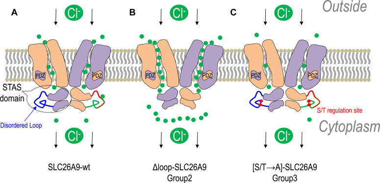 Figure 10. Role of disordered loop and S/T motif within STAS domain in the function of SLC26A9 (proposed dimer model). A, SLC26A9 dimer cartoon representing the human SLC26A9 cryo-EM structure (PDB: 7CH1) (19). In the WT SLC26A9 (SLC26A9-wt), the disordered loop (blue line on left, red-brown-green on right, colors in Fig. 7) within STAS domain forms a filter gate as a dimer for the Cl- channel activity. As noted by Chi and co-workers, the STAS domain of monomer 2 (purple) is below monomer 1 (light orange) and interact at TM8. The C terminus of monomer 2, also structurally interacts with TM8 of monomer 1 (see PDZ designation). The same interactions occur between monomer 2 and the STAS and C terminus of monomer 1. B, removal of the gate, results in greatly increased ionic flux (current and conductance). C, certain S/T variants in 620 to 628 subregions (red pentagons) are suggested to change the structure of this “filter gate” and thus alter ion permeation. In the absence of disordered loop (B) or the K/R region (red lines in A, C), we hypothesize that the channel is fully open and the Cl--HCO3- exchange activity is enhanced. STAS, sulfate transporter and anti-sigma. |
