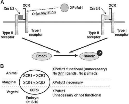 Fig. 7. A schematic model for XPofut1 functional in Xnr signaling. (A) XPofut1 is necessary for Xnr1/2-induced Smad2 phosphorylation. XPofut1 may control Xnr1/2 signaling by O-fucosylation (dashed arrow) of XCRs, the Xenopus laevis EGF-CFC factors. XPofut1 is not necessary for Xnr5/6-induced Smad2 phosphorylation. (B) Spatial pattern of XPofut1 activity and XCR expression in stages 8 to 10 Xenopus laevis embryos. In the vegetal pole region (Vegetal), XPofut1 transcripts are present but XPofut1 function is not necessary for Smad2 phosphorylation. In the marginal zone (Marginal), XPofut1 function is necessary for Smad2 phosphorylation. In the animal cap region (Animal), XPofut1 is functional as shown in animal cap assays (Fig. 6), yet there are no Xnr ligands or Smad2 phosphorylation in this region. See “Discussion” for details. |
