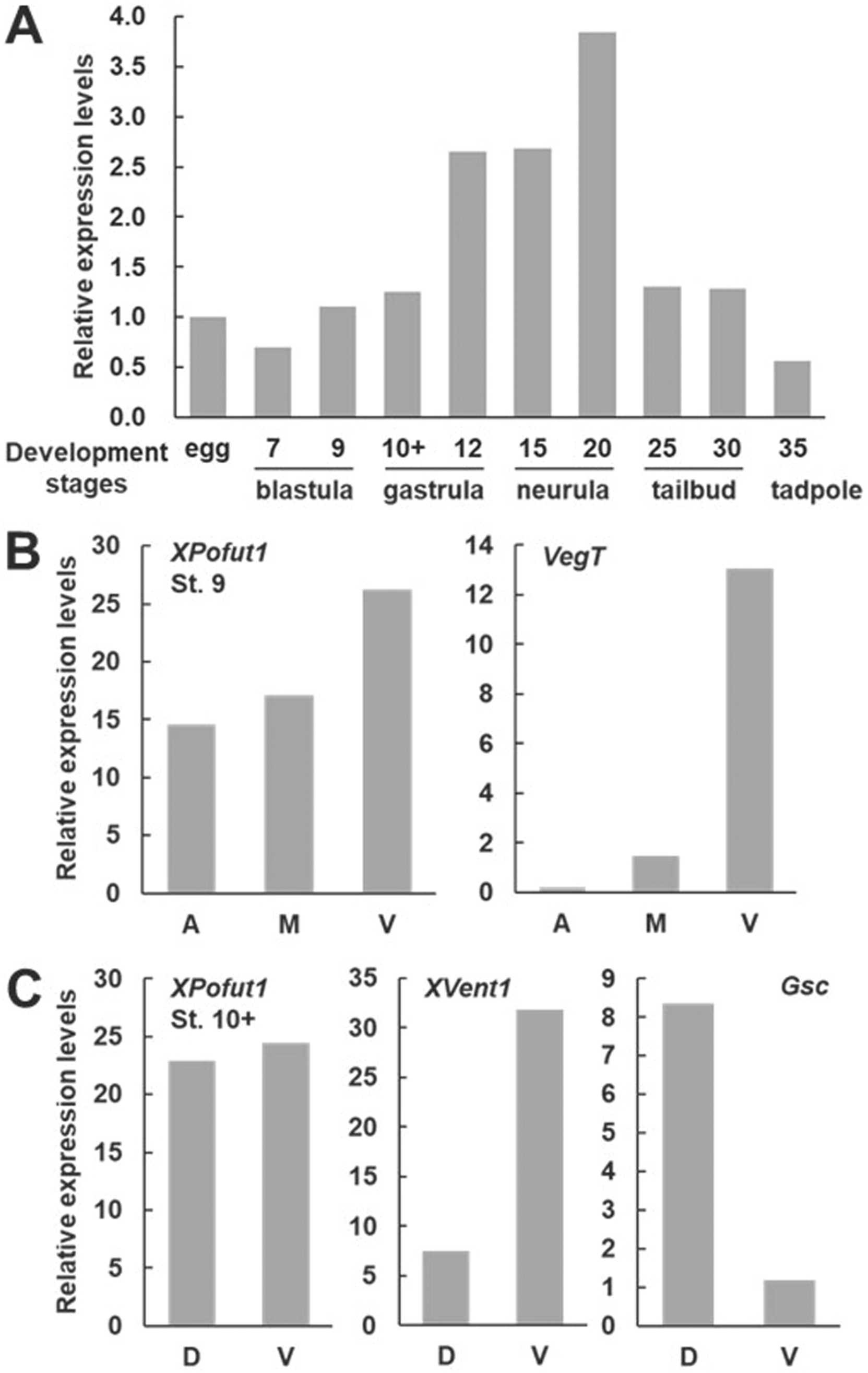 Fig. 1. Expression patterns of XPofut1. Total RNAs from embryos or regions of embryos at indicated stages were isolated, the transcript levels of XPofut1 were analyzed by RT-PCR and normalized with those of EF1. (A) Comparison of the levels of XPofut1 transcripts in unfertilized egg, blastula (stages 7 and 9), gastrula (stages 10+ and 12), neurula (stages 15 and 20), tailbud (stages 25 and 30), and tadpole (stage 35). (B) Stage 9 embryos were divided into the animal (A), marginal (M), and vegetal (V) regions. The levels of VegT (a ventral marker) transcripts are compared to confirm the accuracy of dissection. (C) Stage 10 embryos were divided into the dorsal (D) and vegetal (V) halves. The levels of Gsc (a dorsal marker) and XVent1 (a ventral marker) transcripts are compared to confirm the accuracy of dissection. |