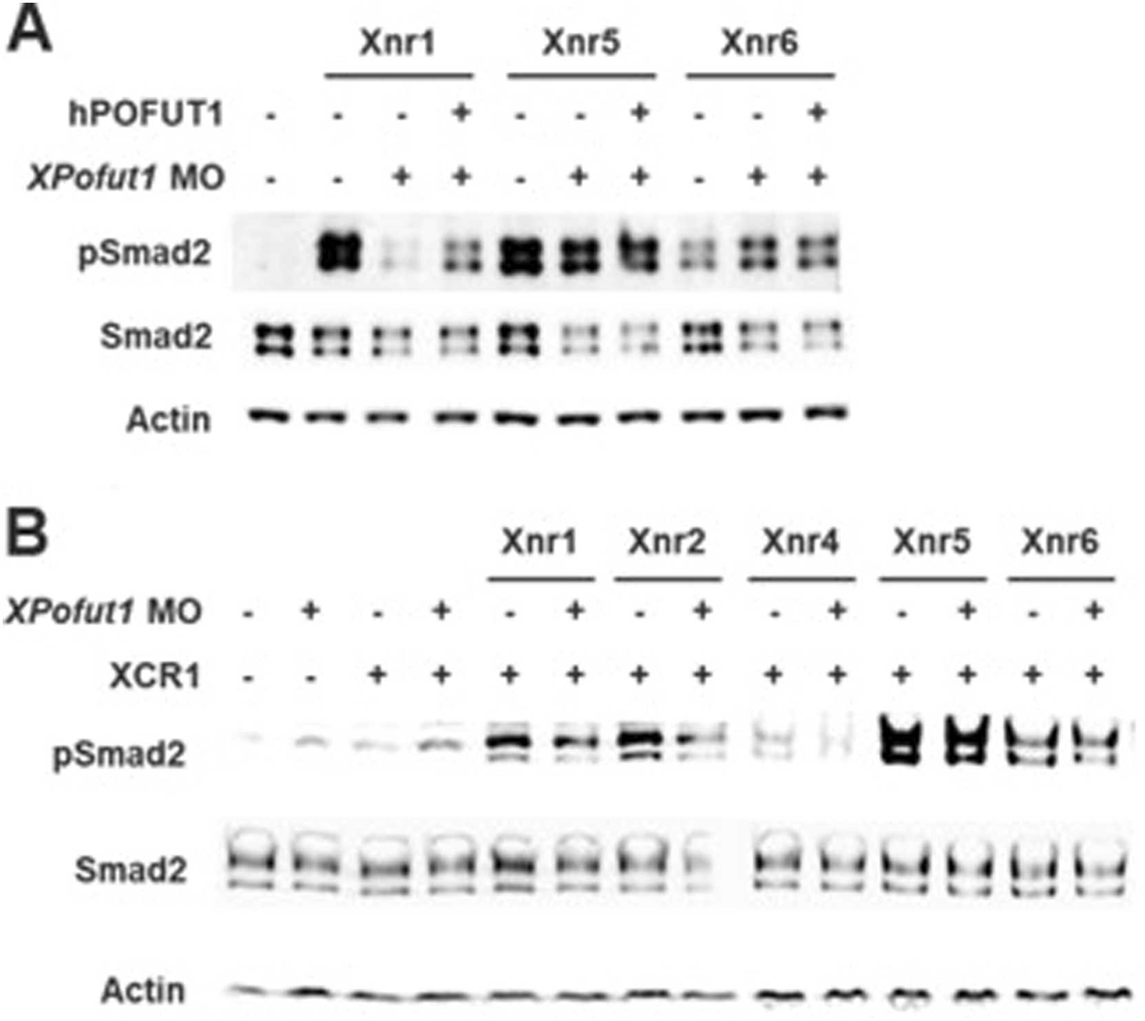 Fig. 6. XPofut1 regulates Xnr1 and Xnr5/6 signaling differently. Embryos were injected with indicated combinations of MO and mRNA. Animal caps were explanted at stage 8.5, cultured until stage 9.5, and harvested to analyze the levels of phosphorylated Smad2 (pSmad2) by immunoblotting. Levels of total Smad2 (Smad2) are also compared and actin is used as a loading control. (A) Embryos were injected into marginal regions with indicated combinations of XPofut1 MO (5 nmole/embryo) and mRNAs encoding Xnr1 (125 pg/embryo), Xnr5 (40 pg/embryo), or Xnr6 (300 pg/embryo) at 2-cell stage, and then injected into 4 animal blastomeres with hPOFUT1 mRNA (100 pg/embryo) at 8-cell stage. (B) Embryos were injected into marginal regions with indicated combinations of XPofut1 MO (5 nmole/embryo) and mRNAs encoding Xnr1 (125 pg/embryo), Xnr2 (20 pg/embryo), Xnr4 (100 pg/embryo), Xnr5 (40 pg/embryo), Xnr6 (300 pg/embryo), or XCR1 (250 pg/embryo) at 2-cell stage. |