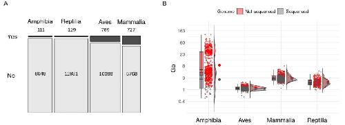 Fig. 1Estimated genome size across tetrapod classes in relation to sequenced genomes. A Mosaic plot representing the percentage of species with sequenced genomes as a proportion of the number of described species for each tetrapod class (Yes: % species with sequenced genome; No: % species without sequenced genome). B Combined box and density plot with raw data as points comparing genome size of species with sequenced genome (gray; genome sizes from NCBI genome assemblies) versus a subset of species without a sequenced genome (red; genome sizes from the Animal Genome Size Database) for each tetrapod class. The y-axis is log-transformed to facilitate visualization. Information about sequenced genomes and genome sizes was obtained from the NCBI Genome Browser, the Animal Genome Size database, and amphibian records from [12, 13]