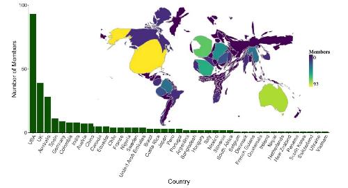 Fig. 4Amphibian Genomics Consortium (AGC) membership by country. Inset map showing the size of each country scaled by number of members in the AGC