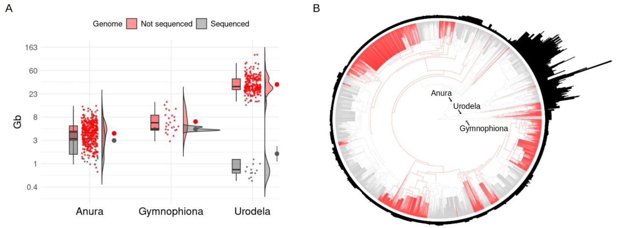 Fig. 2Estimated genome size across amphibian orders in relation to sequenced genomes. A Combined box and density plot with raw data as points showing genome size of species with sequenced genome (gray color; genome sizes from NCBI genome assemblies) versus a subset of species without available genome assembly (red color; genome sizes from the Animal Genome Size Database) for each amphibian order. The y-axis is logarithmic transformed to facilitate visualization. Information about sequenced genomes and genome sizes was obtained from the NCBI Genome Browser, the Animal Genome Size database [13], and amphibian records from [12]. B Amphibian phylogenetic tree was adapted from [17], which includes species with genome size estimates from Genomes on a Tree (GoaT) [18]. Branches are color coded to represent families without any genomic record (in red) and families with at least a representative genome sequenced (in gray). Bar plots around the phylogeny indicate relative genome sizes