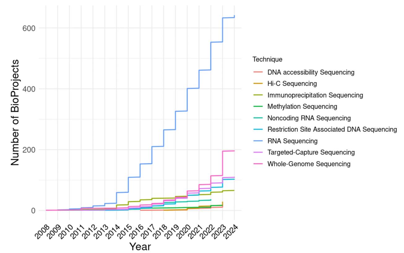 Fig. 3Main sequencing techniques applied to amphibian genomics studies. Yearly cumulative number of amphibian BioProjects split and color-coded by sequencing technique (DNA accessibility Sequencing includes ATAC-Seq and Mnase-Seq; Immunoprecipitation Sequencing includes: ChIP-Seq and RIP-Seq; Amplicon sequencing was included with Targeted-Capture Sequencing; Noncoding RNA Sequencing includes: miRNA-Seq and ncRNA-Seq). BioProject information was obtained from the NCBI Sequence Read Archive (SRA, accessed 1 March 2024)
