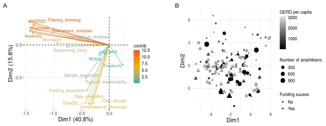 Fig. 5Sequencing competencies and identified challenges of the members of the Amphibian Genomics Consortium (AGC). A Representation of the contribution of the AGC survey quantitative questions to the first dimensions after computing a principal component analysis (PCA). Bioinformatic competencies and perceived challenges were grouped into dimensions one and two, respectively. B Scatter plot showing PCA scores for each AGC survey respondent. Respondent answers are coded by the qualitative question about funding success for amphibian genomics projects using shape; number of amphibian species of the respondent main affiliation country by size, and gross domestic expenditure on R&D (GERD) per capita of the respondent main affiliation country by gray-scale color coded. Information about the number of amphibian species per country was obtained from AmphibiaWeb. GERD per capita was calculated using information from the UNESCO and World Bank websites from the information about the most recent year for each country