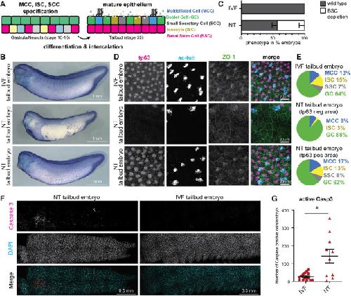 (F) Cleaved caspase-3 (Asp175) IF stainings of NT and IVF embryos at the tailbud stage. Nuclei in cyan (DAPI); cleaved Casp3 in red.