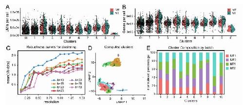 and NT. (B) Number of genes identified per cell for each cluster. Coloured by condition IVF and NT. (C) Variation of Information (VI)