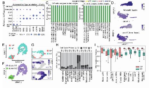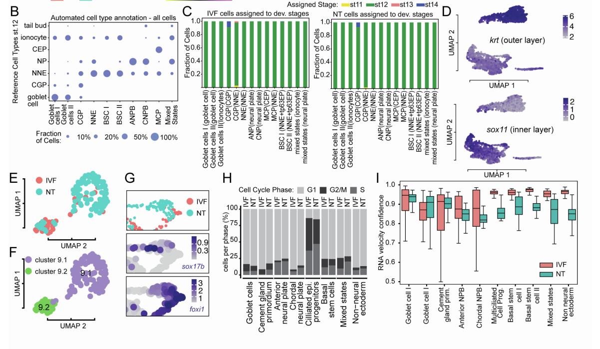 NT- and IVF- cells of Cluster 9 of panel D. (H) Cell-cycle analysis of NT and IVF epidermal cells per cluster using cyclone. Each bar