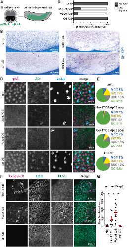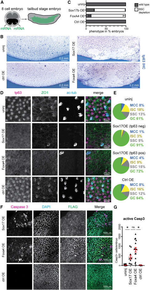 (C) Proportions of embryos displaying depletion of Tp63+ basal stem cell (BSC) (white bar) across conditions. Uninjected condition n = 15, each overexpression conditions n = 14; samples stem from 3 independent experiments.