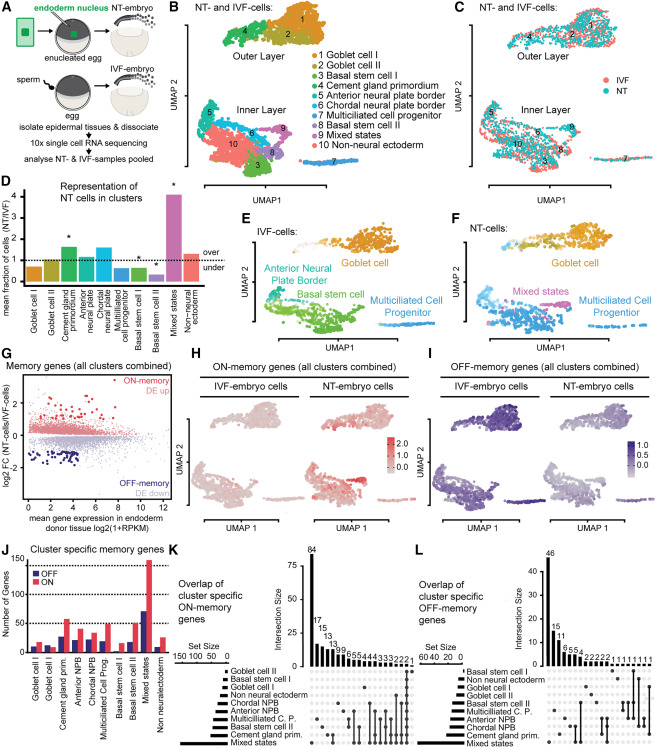 Figure 1. Differentiation defects vary across epidermal cell types and are associated with incomplete transcriptome reprogramming(A) Design of scRNA-seq experiment. Sample size for NT n = 10, and for IVF n = 10.(B and C) (B) UMAP plot of scRNA-seq data from IVF and NT cells colored by cluster (C) or by condition.(D) Cell type compositional analyses of scRNA-seq data, each bar representing the mean fraction of NT over IVF cells in each cell cluster. Over, overrepresented in NT embryos; under, underrepresented in NT embryos. ∗ FDR < 10−5 Wald test.(E) UMAP showing IVF cells colored by terminal state of differentiation computed using CellRank. Colors match cell clusters shown in (B). Darker colors indicate a higher probability of assignment to a terminal state.(F) NT cells analyzed and visualized as described in (E).(G) MA plot comparing gene expression between NT and IVF cells. FC, fold change; RPKM, reads per kilobase per million.(H) UMAP plot of ON-memory gene expression in NT and IVF cells. For each cell, the average of the scaled and centered expression levels of the ON-memory genes is shown.(I) Same as (H), showing expression of OFF-memory genes.(J) Bar plot displaying counts of ON- and OFF-memory genes in epidermal cell types of NT embryos.(K) UpSet plot showing the overlap of ON-memory genes across cell types in NT embryos. Horizontal bar plot: number of ON-memory genes detected in each cell type. Vertical bar plot: number of intersected genes between cell states. Connected dots represent overlap. NPB, neural plate border.(L) UpSet plot showing the overlap of OFF-memory genes across cell types in NT embryos as described in (K). |