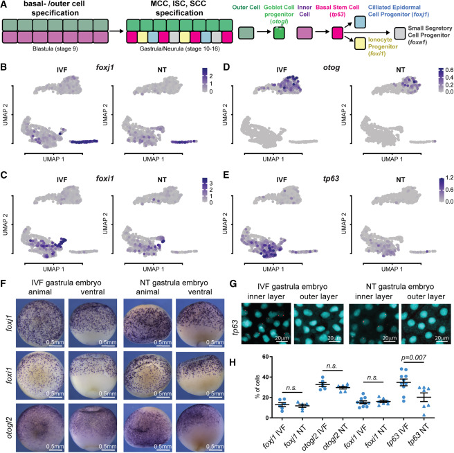(H) Quantification of (F) and (G); foxj1, IVF n = 5, NT n = 5; for otogl2, IVF n = 8, NT n = 6; for foxi1, IVF n = 10 NT n = 7; for tp63, IVF n = 10, NT n = 7; p value: unpaired t test, lines: mean and standard error of the mean. |