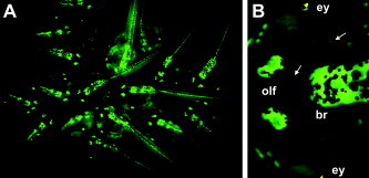 Figure 3. Pax-6/green fluorescent protein (GFP) transgenics show complex patterns of gene expression in later development, demarcating numerous subdomains within the brain, spinal cord, and sensory tissues. A: A group of Pax-6/GFP transgenic F2 siblings at late swimming tadpole stages (Nieuwkoop and Faber stage 43â45; Nieuwkoop and Faber, 1956). Note the consistency of GFP pattern and intensity between tadpoles. B: A high-magnification view of the head of a Pax-6/GFP primary transgenic tadpole at stage 46. Pax-6/GFP is expressed in the brain (br), eye (ey; GFP fluorescence is blocked in this image by the pigmented retina), and olfactory placodes (olf). Arrows point to the olfactory nerve (between olfactory placodes and brain) and optic nerve (between eye and brain), which show low, but detectable, levels of GFP fluorescence. Small clusters of cells on the skin, which may be part of the lateral line (Winklbauer, 1989), also express GFP.