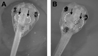 Figure 5. A putative X. tropicalis ear mutant uncovered by gynogenesis. A normal tadpole, stage 42, is on the left (A) and a homozygous mutant tadpole on the right (B). Note the enlarged otic vesicles (compare white outlines) and lack of otoconia (white calcifications within the inner ear, marked by black arrows) in the mutant.
