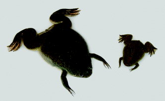 Figure 1. Adult Xenopus laevis and Xenopus tropicalis appear similar, except for size. Female X. laevis (left) and female X. tropicalis (right).