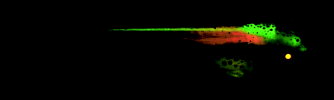 Figure 4. A triple transgenic X. tropicalis tadpole. Red fluorescence in the muscle is produced by expression of a transgene coupling the cardiac actin promoter with red fluorescent protein (RFP). Green fluorescence in the brain is produced by the Pax-6 promoter coupled to green fluorescent protein (GFP). The yellow color of the lens of the eye is produced by the combination of Pax-6/GFP expression in the neural retina and gamma-crystallin/RFP expression in the lens.