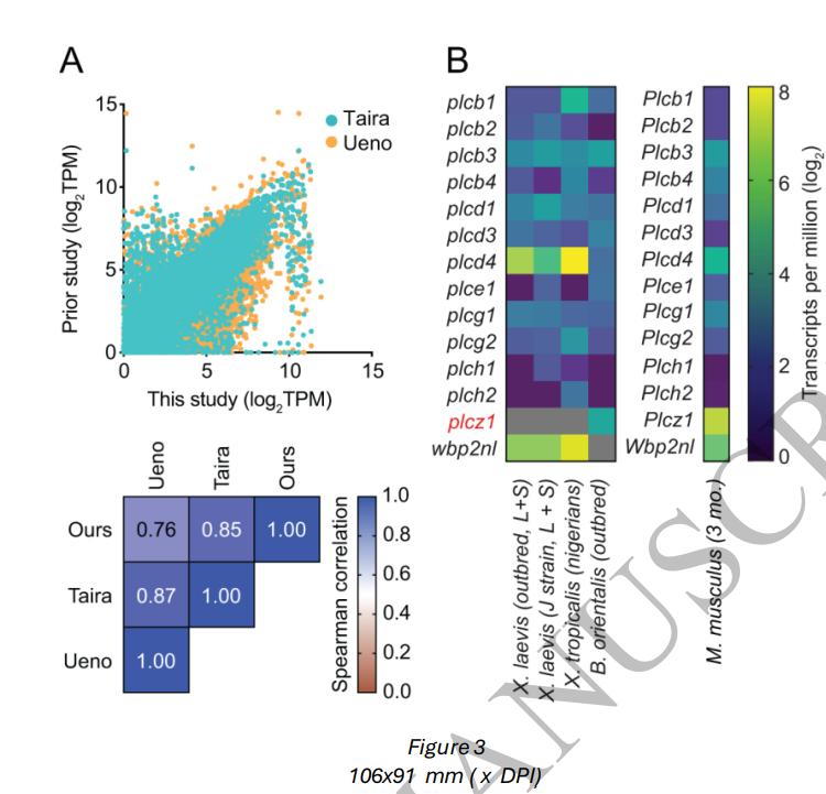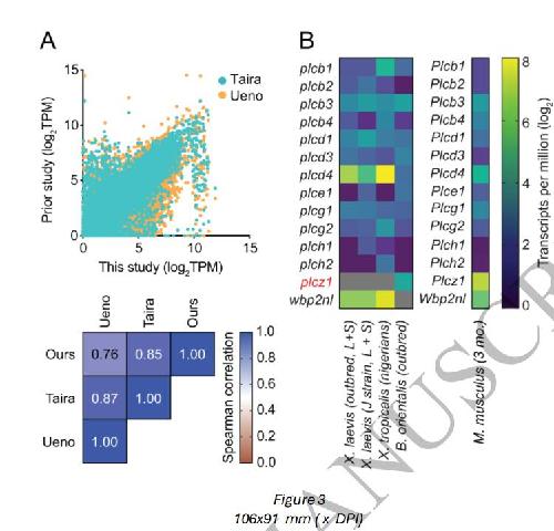 of transcript counts between this study and previous ones (Session, et al. 2016); Spearman