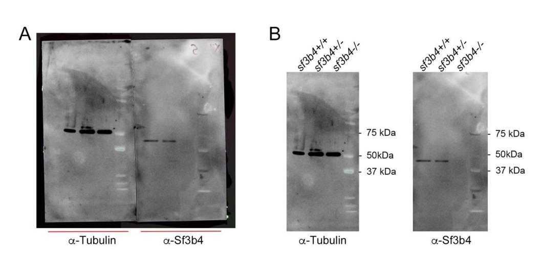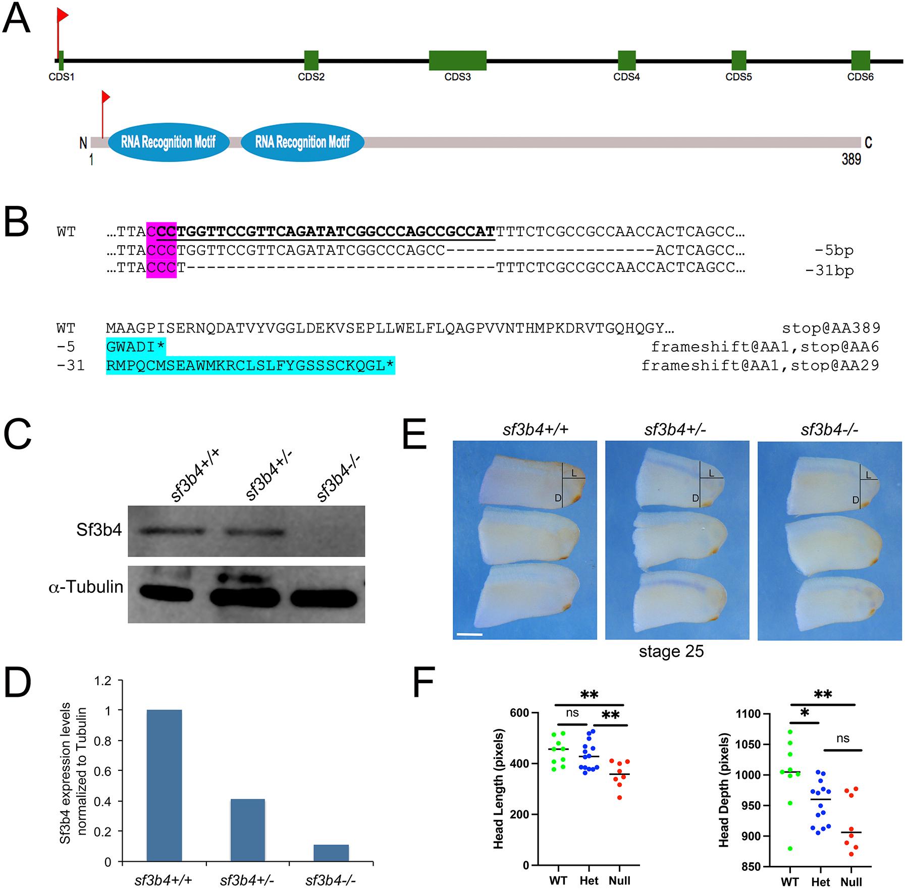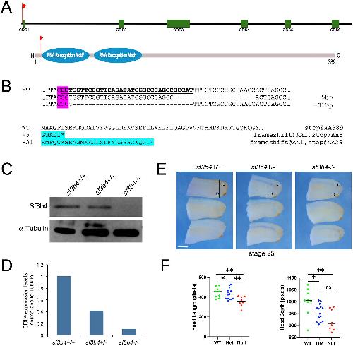 Fig. 2.Generation of a Xenopus tropicalis CRISP/Cas9 sf3b4 mutant line. (A) Schematic of the genomic sf3b4 locus, and Sf3b4 protein. The relative position of the sgRNA target sequence is indicated (red flags). CDS1-CDS6 represent exons 1-6. (B) Alignment of wild-type (WT) and 5bp or 31bp mutated nucleotide sequences. The PAM sequence is indicated (magenta). A frameshift in the mutant nucleotide sequence results in an incorrect protein sequence with an early stop (asterisk) after amino acids 5 and 28, respectively (cyan). Shown underlined is the targeted nucleotide sequence. (C) Western blot analysis of protein extracts from WT (+/+), heterozygote (+/) and homozygote (/) F2 tailbud-stage embryos (NF stage 25), using an anti-Sf3b4 antibody. -Tubulin is shown as a loading control. n=10. (D) ImageJ quantification of the western blot. (E) sf3b4 mutant embryos at stage 25 have reduced head length and width compared to WT. The distances measured to quantify head length (L) and depth (D) are indicated on the embryo at the top for each genotype. Lateral views, anterior to right, dorsal to top. (F) Graph plotting the length and width for all three genotypes. ns, not significant. *P<0.05, **P<0.01 (Welch's two-tailed unpaired t-test). n=9 (WT), 14 (Het), 8 (Null). Scale bars: 150m. |
