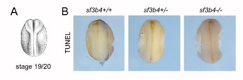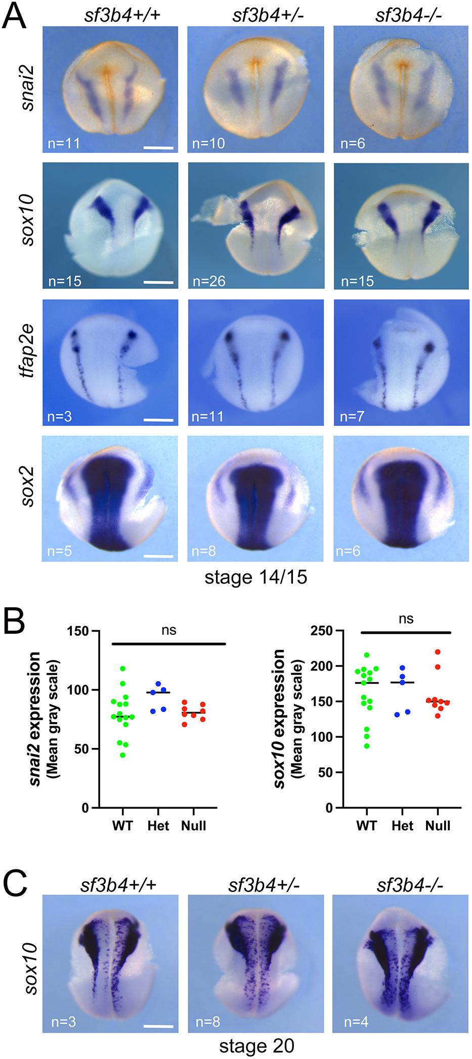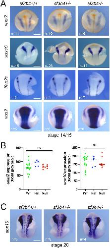 Fig. 3.Molecular characterization of sf3b4 mutant embryos at neurula stages. (A) At NF stage 14/15, the expression of snai2, sox10 and tfap2e in NC progenitors is largely unaltered in all three genotypes: sf3b4 WT (+/+), heterozygote (+/) and homozygote (/). The neural plate expression of sox2 is also unaffected. (B) ImageJ quantification of snai2 and sox10 WMISH signal. ns, not significant. Welch's two-tailed unpaired t-test (see labeling within panel images for n numbers). (C) At the end of neurulation, NF stage 20, the expression of sox10 is largely unaltered in all three genotypes. (A,C) Dorsal views, anterior to top. Scale bars: 300m. |