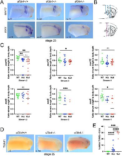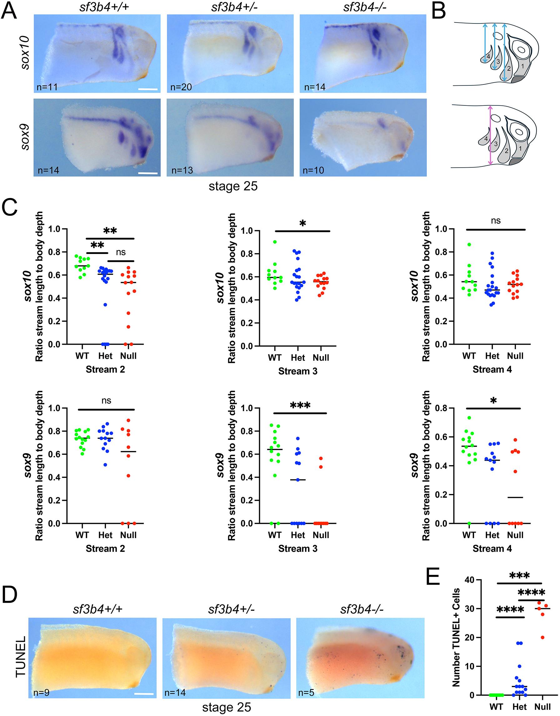 Fig. 4.Molecular characterization of sf3b4 mutant embryos at tailbud stage. (A) At NF stage 25, the expression of sox9 and sox10 in the NC streams is reduced or absent in heterozygous and null embryos. sf3b4 WT (+/+), heterozygote (+/) and homozygote (/). (B) Diagrams illustrating the position of the NC streams (1-4), and the distance measured to quantify NC streams length (top, blue lines) and its normalization to body depth (bottom, magenta line). (C) Quantification of stream length compared to full body width of embryos. ns, not significant. *P<0.05, **P<0.01, ***P<0.001 (Welch's two-tailed unpaired t-test; see labeling within panel images for n numbers). (D) TUNEL staining of NF stage 25 embryos. (E) Quantification of TUNEL staining. ***P<0.001, ****P<0.0001 (Welch's two-tailed unpaired t-test; see labeling within panel images for n numbers). (A,D) Lateral views, anterior to right, dorsal to top. Scale bars: 150m. |