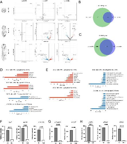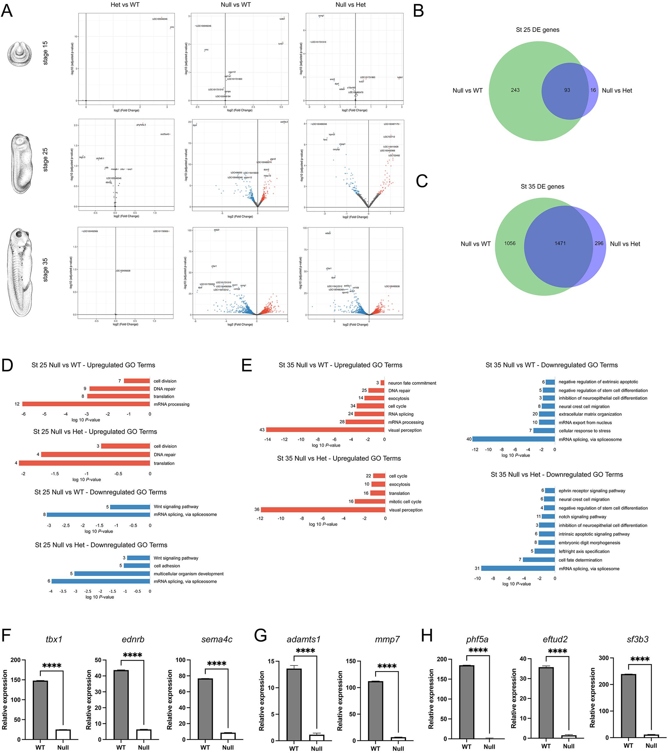 Fig. 6.RNA-seq analysis of differentially expressed genes in WT and sf3b4 mutant embryos. (A) Volcano plots showing significance (y-axis; log10-adjusted P-value) versus amplitude (x-axis; log2-fold change) of differentially expressed genes across genotypes and stages. Genotype comparisons (Het versus WT, Null versus WT and Null versus Het) are indicated at the top and embryonic stage (stages 15, 25 and 35) on the left. The top ten genes for each comparison are labeled with their Xenbase ID. Xenopus illustrations Natalya Zahn (Xenbase; www.xenbase.org RRID:SCR_003280) (Zahn et al., 2022). (B,C) Venn diagram analysis of differentially expressed (DE) genes at stage 25 (B) and stage 35 (C), comparing Null versus Wt and Null versus Het. (D,E) Gene Ontology (GO) term analysis of differentially expressed genes at NF stage 25 (D) and stage 35 (E). Upregulated terms are in red, downregulated terms in blue. The numbers at end of the bars indicate the number of genes in each GO category. (F-H) qRT-PCR validation of a subset of downregulated genes in Null versus WT stage 35 embryos, from the neural crest cell migration (F), extracellular matrix organization (G) and mRNA splicing, via spliceosome (H) GO term categories. ****P<0.0001 (Welch's two-tailed unpaired t-test). n=3. Error bars represent +s.d. |