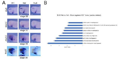 per genotype. (B) GO term analysis for downregulated genes in Het vs Null at stage 35