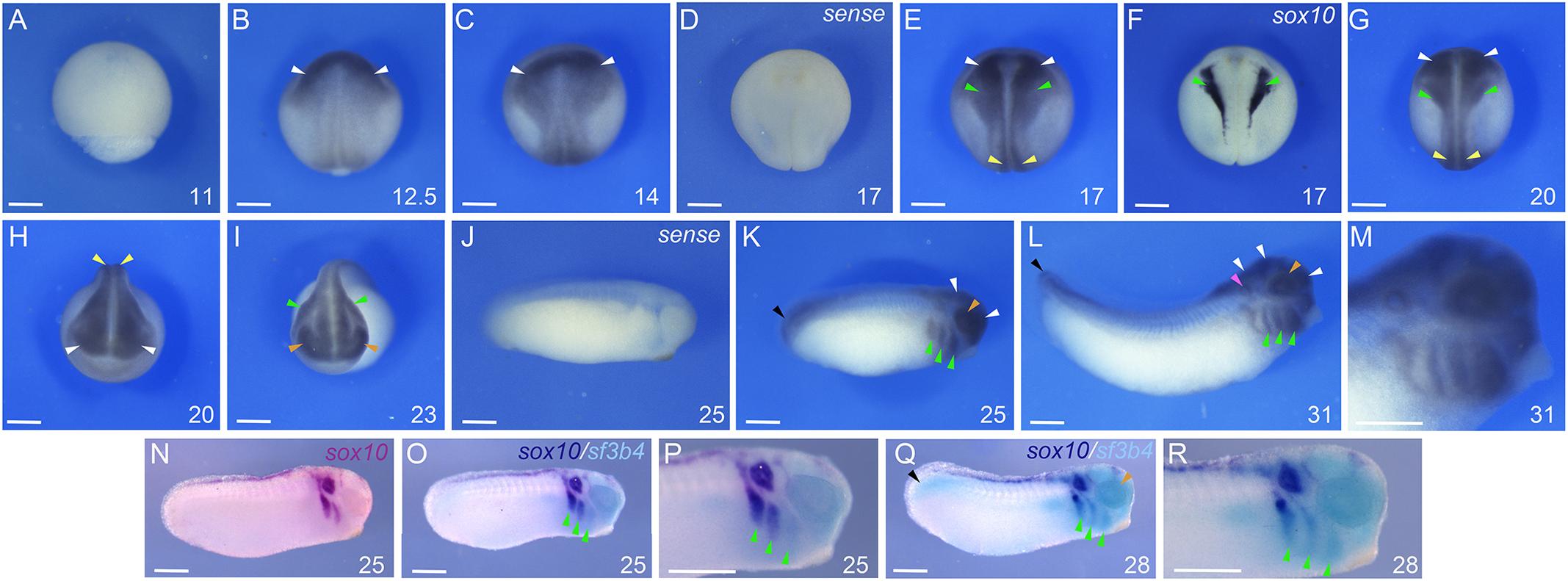 Fig. 1.Developmental expression of Xenopus tropicalis sf3b4. (A-M) sf3b4 is not expressed at the mid-gastrula stage (A) but is first detected at the end of gastrulation in the dorsal ectoderm (B). During neurulation (C,E-H), sf3b4 transcripts are detected in the developing neural plate/tube and neural crest (NC)-forming regions, where it overlaps with sox10 (F). At tailbud stages (K-M), sf3b4 expression persists in the brain, eyes, migrating NC cells, and is also detected in the otic vesicles and the tailbud. Anterior neural plate/developing brain (white arrowheads), prospective spinal cord (yellow arrowheads), neural crest (green arrowheads), developing eyes (brown arrowheads), otic vesicle (magenta arrowhead) and tailbud (black arrowheads) are indicated. Embryos hybridized with a sense control are shown for stage 17 (D) and stage 25 (J). (N-R) Two-color WMISH for sox10 and sf3b4 at stage 25 (O,P) and stage 28 (Q,R), reveals co-expression of these genes in the migrating NC cells populating the posterior branchial arches. At these stages, sox10 expression is progressively downregulated in the most anterior NC streams (N). (A-G) Dorsal views, anterior to top. (H,I) Frontal views, dorsal to top. (J-R) Lateral views, anterior to right, dorsal to top. The embryonic stages (NF) are indicated in the lower right corner of each panel. Images are representative of 25 samples. Scale bars: 150m. |