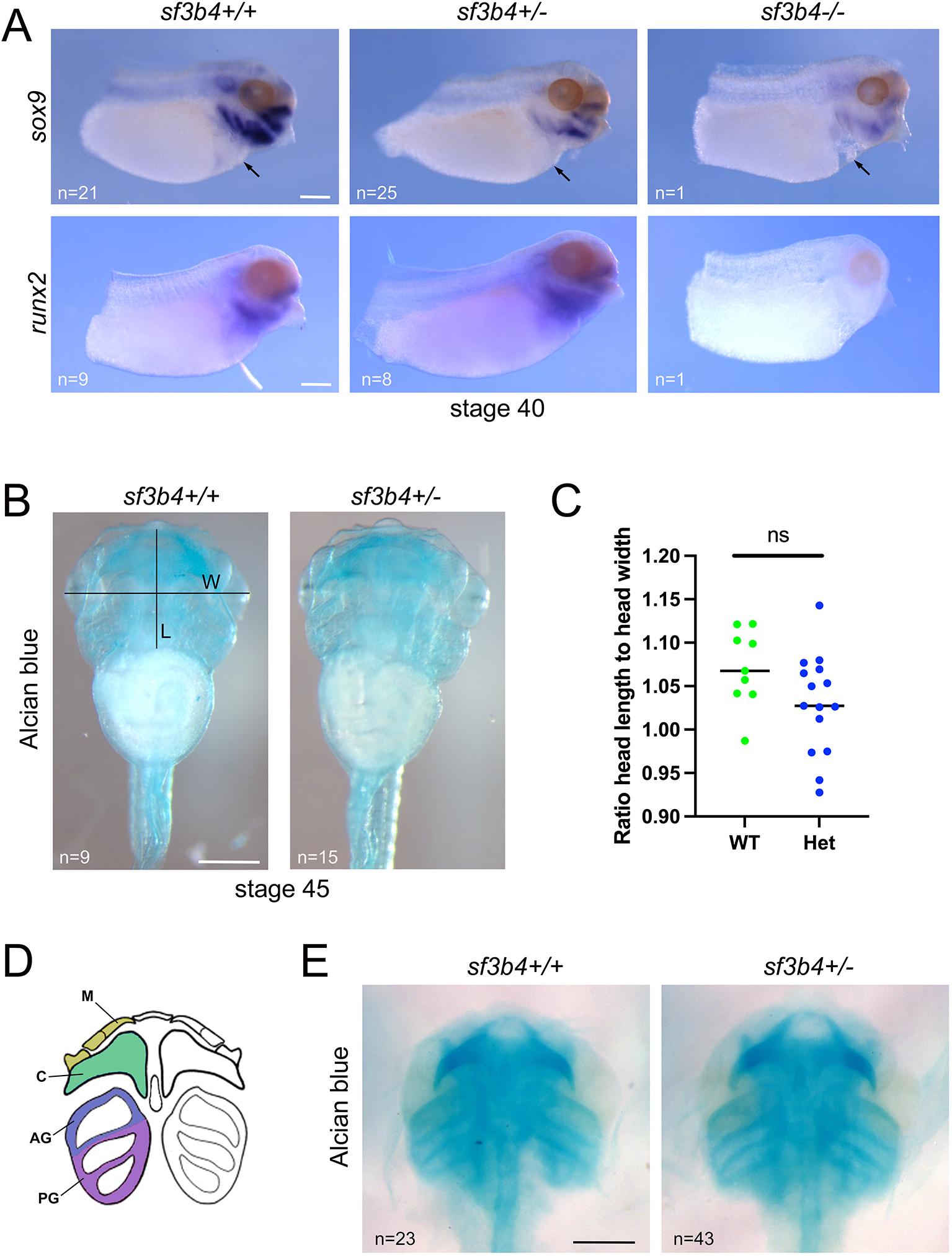 Fig. 5 Molecular characterization of the sf3b4 mutant tadpoles. (A) At NF stage 40, sox9 and runx2 expression in the branchial arches is severely reduced in Null embryos. Lateral views, anterior to right, dorsal to top. sf3b4 WT (+/+), heterozygote (+/) and homozygote (/). Scale bars: 150m. (B) Alcian Blue-stained tadpoles, NF stage 45. Ventral views, anterior to top. sf3b4 WT (+/+) and heterozygote (+/). Head width (W; distance from eyeball to eyeball) and head length (L; distance from the mouth to the gut) measurements are indicated. Scale bar: 500m. (C) Graph plotting the ratio head length to head width for WT and Het tadpoles. ns, not significant. Welch's two-tailed unpaired t-test. n=9 (WT), 15 (Het). (D) Diagram illustrating the NC-derived cranial cartilages at the tailbud stage (modified from Sadaghiani and Thiebaud, 1987). From anterior to posterior, Meckel's cartilage (M), ceratohyal cartilage (C), and anterior (AG) and posterior (PG) gill cartilages. (E) Ventral views of dissected craniofacial cartilages of sf3b4 WT (+/+) and heterozygote (+/) tadpoles. n, number of embryos analyzed per genotype. Scale bar: 500m. |
