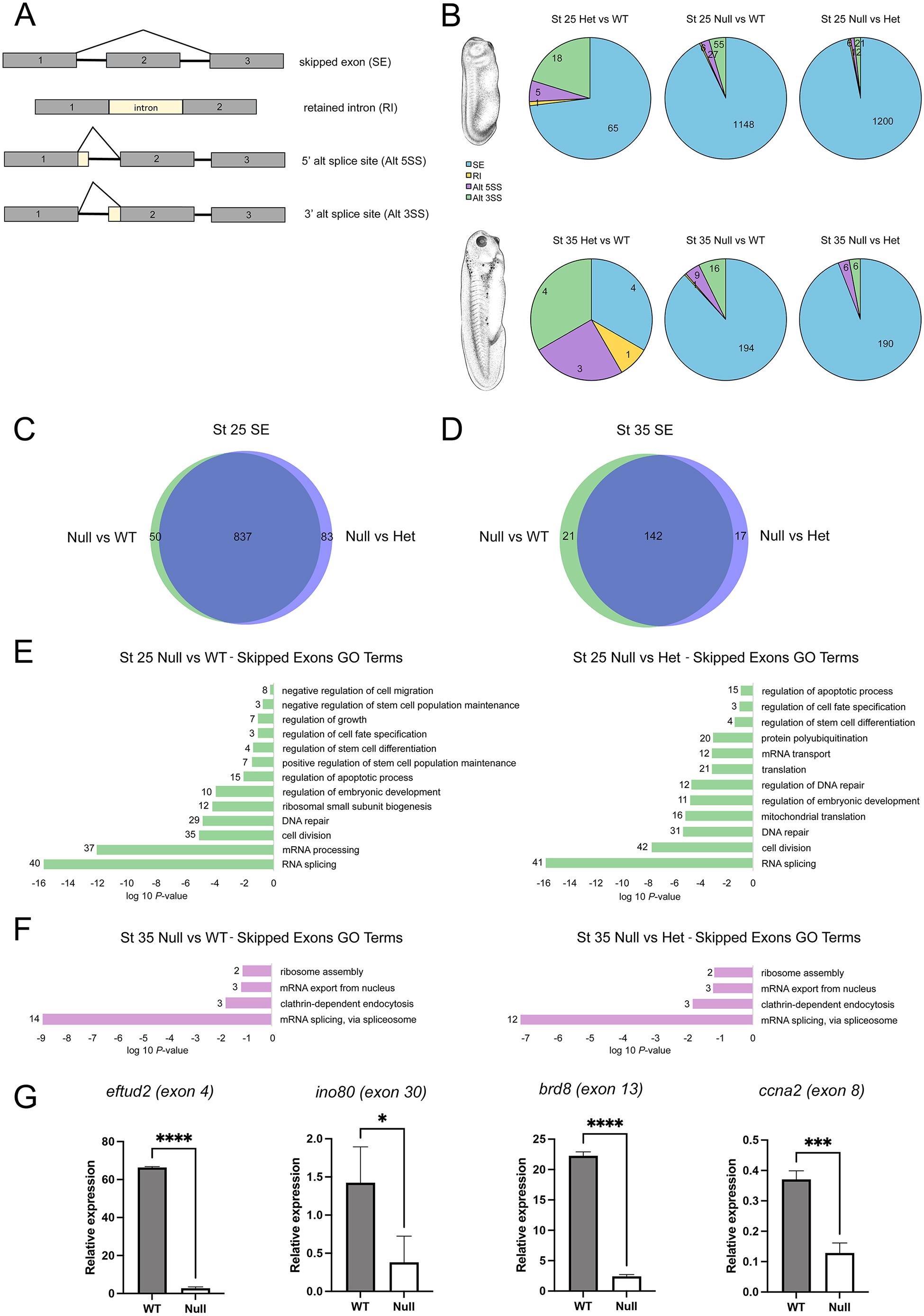 Fig. 7.RNA-seq analysis of splicing events in WT and sf3b4 mutant embryos. (A) Diagram of splicing events considered in this analysis. (B) Pie charts showing the type and number of splicing events occurring for each genotype comparison (Het versus WT, Null versus WT and Null versus Het) at stage 25 and stage 35. Xenopus illustrations © Natalya Zahn (Xenbase; www.xenbase.org RRID:SCR_003280) (Zahn et al., 2022). (C,D) Venn diagrams for genes with skipped exon at NF stage 25 (C) and stage 35 (D). WT and Het samples show substantial overlap at both stages. (E,F) GO term analysis for genes with skipped exon at NF stage 25 (E) and stage 35 (F). The numbers at end of the bars indicate the number of genes in each GO category. (G) qRT-PCR validation of a subset of representative genes with abnormal skipped exon in Null versus WT stage 25 embryos, from the ‘RNA splicing’ (eftud2), ‘regulation of apoptotic process’ (brd8), ‘cell division’ (ccna2) and ‘regulation of embryonic development’ (ino80) GO term categories. *P<0.05, ***P<0.001, ****P<0.0001 (Welch's two-tailed unpaired t-test). n=3. Error bars represent +s.d. |