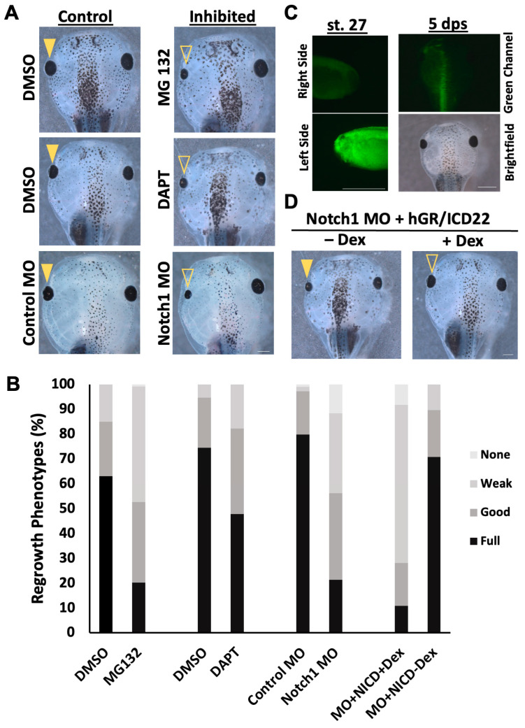 Figure 1. Reduced Notch impairs eye regrowth. (A) Comparison of 5 dps tadpoles treated with DMSO (control), Notch inhibitors (MG132 or DAPT), or injected with Notch morpholino (n > 30 per condition). Images at 20.5×. Up = anterior. (B) Graph showing the percentage of the population achieving full regrowth at 5 dps. (C) Morpholino expression at st. 27 and 5 dps. Cells containing morpholino showed green fluorescence due to the fluorescein-tagged oligonucleotide. The top left panel shows the right side of the embryo, right = anterior. The bottom left panel shows the left side of the same embryo, right = posterior. For both, up = dorsal. Images at 48×. The tadpole at 5 dps still exhibits green fluorescence on the left side of the animal. The top right panel is a green channel showing the fluorescein tag on the morpholino at 5 dps, showing the persistence of morpholino throughout the regrowth period. The bottom right panel is the corresponding brightfield image. Up = anterior. Image at 25×. Scale bar = 500 μm. (D) Comparison of 5 dps tadpoles expressing the Notch1 morpholino and the Dex-inducible NICD construct in the left eye region. The left panel shows regrowth without the Dex inducer; the right panel shows regrowth with Dex. The closed arrowhead indicates a control regrowth-inhibited eye. The open arrowhead indicates rescued eye growth (n > 30 per condition). Images at 20.5×. Up = anterior, down = posterior. (A,C,D) Scale bar = 500 μm.