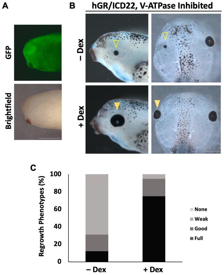 Figure 5. Notch1 overexpression during regrowth rescues V-ATPase inhibition. (A) Notch1 RNA is present in the eye at the time of surgery. Image of a st. 27 embryo head injected at st. 3 with GR-NICD RNA and GFP RNA. Right = posterior, left = anterior, up = dorsal, and down = ventral. Images at 48×. (B) Comparison of tadpoles at 3 dps (left) and 5 dps (right) treated with Concanamycin, injected with Dex-inducible NICD at st. 3, and treated with or without inducer immediately following ablation. Closed arrowhead indicates control regrowth-inhibited eye. Open arrowhead indicates rescued regrown eye through NICD overexpression. n > 30 per condition. Images at 25×. Scale bar = 500 μm. (C) Graph showing the percentage of the population achieving full regrowth at 5 dps with or without NICD activation. Up = dorsal and left = anterior.