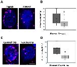 Figure 4. Reduction in Notch during eye regrowth reduces proliferation. (A) Transverse eye sections at 1 dps showing mitosis cells in DMSO or MG132-treated eyes (n > 5 per condition). Magenta = phosphorylated Histone 3, Blue = Xen1. Images at 20×. (B). Box and whisker plot comparing the number of H3P-positive cells normalized to area. (C) Transverse eye sections at 1 dps comparing proliferating cells in control morpholino and Notch1 morpholino injected eyes (n > 5 per condition). Magenta = phosphorylated Histone 3, Blue = Xen1. Images at 20×. Scale bar= 100 μm. (D) Box and whisker plot comparing number of H3P-positive cells normalized to area. * = p < 0.01. Up = dorsal and left = anterior.
