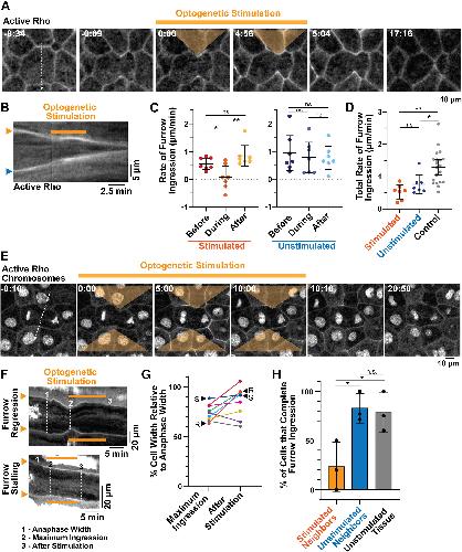 (E) Time-lapse confocal imaging of cytokinesis with optogenetic stimulation of Rho-mediated actomyosin contractility in neighbors on both sides of the furrow. Orange triangles and line indicate the region and duration of stimulation, respectively. Time shown in min:s.